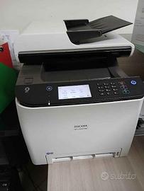 Il dispositivo nell'immagine è una stampante multifunzione laser a colori Ricoh M C250FWB. Funzionalità: Stampa, copia, scansione e fax in un unico dispositivo compatto. Velocità: Raggiunge una velocità di stampa di 25 pagine al minuto, sia a colori che in bianco e nero. Connettività: Dispone di connessione Wi-Fi ed Ethernet LAN per l'uso in rete. Gestione documenti: Include un alimentatore automatico di documenti (SPDF) per scansioni fronte-retro in un unico passaggio