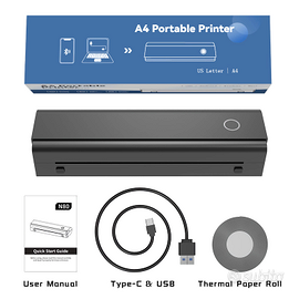 Stampante termica portatile A4 JIUYIN N80 con connessione Bluetooth e cavetto, zero inchiostro, non usa inchiostro o toner per stampare. Ideale per la stampa in mobilità da smartphone, tablet e pc di documenti vari formati e template tatuaggi. Include manuale, cavo USB e un rotolo di carta termica omaggio. Utilizza fogli o rotoli specifici, più economici della carta tradizionale. La stampa senza inchiostro garantisce un risparmio significativo sulla gestione e manutenzione. Design compatto e leggero (0.95 kg) per un facile trasporto. Velocità di stampa 15mm/s e risoluzione di 203 dpi. Batteria ricaricabile da 2600 mAh anche in macchina/camion con una presa usb o da caricatore. Controllo da app gratuita Nada Print, disponibile gratis su Google Play ed Apple store. Dimensioni confezione 33*11*11 cm. Si prenda visione del video dimostrativo di una stampa. Perfetta per imprese di trasporto che rilasciano fatture e ddt alla consegna. In allegato all'annuncio manuale originale in inglese e manuale tradotto in Italiano. Assitenza post vendita per qualsiasi problema. Acquisto sicuro da impresa italiana con 100% feedback positivi.