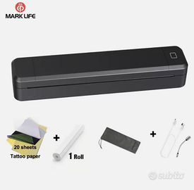 Stampante termica portatile A4 Mark Life wireless con connessione Bluetooth, zero inchiostro, non ha bisogno di continue ricariche cartucce o toner, per stampa da cellulare, tablet e PC. Ideale per stampa di documenti e template tatuaggi in mobilità e viaggio, per lavoro o svago. Lingue supportate: Italiano, Cinese, Inglese, Giapponese, Coreano, Tedesco, Francese, Spagnolo. Prodotto dotato delle seguenti certificazioni: CE, FCC, UKCA, ROHS, EMC, WEEE. La confezione include la stampante, il manuale, cavo USB per ricarica e un rotolo di carta termica omaggio. Utilizza carta termica in fogli o rotoli, più economici della carta tradizionale, ed è predisposta per stampare sulla tatto paper. La stampa senza inchiostro garantisce un risparmio significativo sulla gestione e manutenzione. Ha un Design compatto e leggero (0.555 kg) per un facile trasporto, tra le più piccole e leggere della categoria. Velocità di stampa 20mm/s e risoluzione di 203 dpi. Batteria ricaricabile da 1500 mAh. Controllo da app gratuita MarkLife, disponibile su Google Play ed Apple store. Dimensioni della stampante: 26.3*7.7*4.5 cm. Manuale italiano disponibile anche in digitale in allegato all'annuncio. Assistenza post vendita per qualsiasi problema. Acquisto da venditore italiana con 100% feedback positivi.