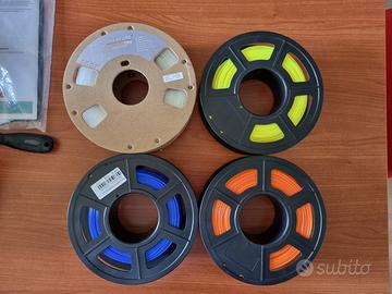 3 bobine di PLA+ (colori arancione, giallo e blu), con più della metà del filamento