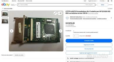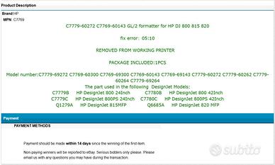 Vendo stampante HP DesignJet 800 formato A0 (42"), attualmente non funzionante. La stampante è stata recentemente pulita e revisionata: manutenzione ordinaria effettuata (pulizia interna, controlli generali, sostituzione cartucce esauste). Il tecnico che l’ha visionata ha diagnosticato un problema alla scheda formatter (part number C7779-60272 / C7769-60143, ecc.): sostituendo questa scheda la stampante dovrebbe tornare pienamente funzionante.