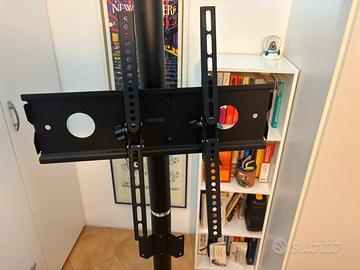 Vendo supporto mobile per schermo Bontec, in metallo nero, con altezza regolabile e ruote per un facile spostamento. Struttura solida e stabile, compatibile con monitor e TV di varie dimensioni.