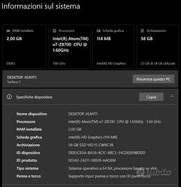 Tablet PC Windows Surface 3 con tastiera QWERTY italiana grigia scura. Memoria 64GB espandibile con micro SD. 2GB di RAM. Presenta qualche segno di usura, la tastiera risutla invece usurata ai lati. Batteria che dura un paio d'ore. Vendo con caricabatterie originale.