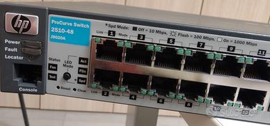 Switch di rete HP Procurve modello 2510-48 (j9020a) layer 2, 48 porte 10/100, 2 porte Gigabyt dual-personality 10/100/1000T, 2 porte SPF. Configurazione attraverso interfaccia web e console, gestione attraverso interfaccia web. Lo switch è aggiornato con l'ultimo firmware disponibile sul sito HP, è stato resettato con le impostazioni di fabbrica. Testato, perfettamente funzionante ed in buono stato stato.