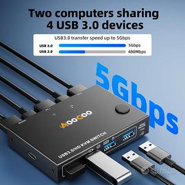 【Switch KVM USB 3.0 e HDMI】Questo switch KVM HDMI consente a 2 computer/laptop di condividere un monitor HDMI e 4 dispositivi USB 3.0 come mouse, tastiera e stampante, webcam, quindi non è solo uno switch per monitor, ma anche uno switch USB 3.0. Questo switch KVM a 2 porte ti aiuterà a risparmiare sui costi e a migliorare notevolmente l'efficienza dell'ufficio.