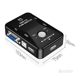 Vendo Switch USB 2.0, usato ma tenuto bene, come in foto. Serve a collegare ad esempio un mouse e una tastiera, anche wireless, a due PC/MAC cambiando a piacimento tramite il pulsante. L'indicatore luminoso specifica quale PC è collegato. In sintesi utile per vuole usare un monitor VGA una tastiera e un mouse con due PC/MAC o un PC e un MAC.