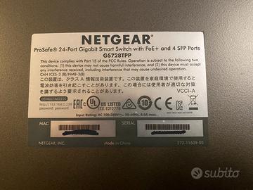 Switch di rete professionale Netgear ProSAFE GS728TPP, 24 porte Gigabit Ethernet con PoE+ e 4 porte SFP, ideale per uffici, studi professionali, server room, impianti di videosorveglianza, access point e VoIP.