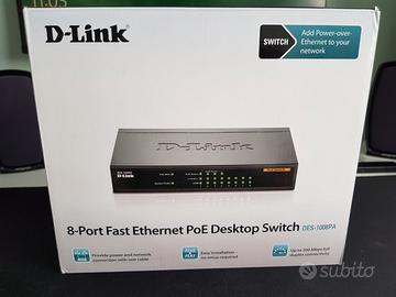 Vendo switch D-Link DES-1008PA, switch desktop non gestito a 8 porte Fast Ethernet, dotato di 4 porte PoE (Power over Ethernet), ideale per ambienti domestici e piccoli uffici.