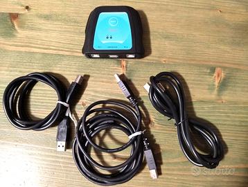 Switch USB 2 PC 1 Stampante. Completo di tre cavi USB per il collegamento dei due PC alla singola stampante. Il tasto sullo switch consente di scegliere il PC da collegare alla stampante.