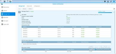 Vendo Synology DiskStation DS1512+ usata con inclusi 10TB di dischi (5x2TB WD Red NAS Hard Drive) E' possibile installare APPs locali scaricabili dallo store e anche alcune APP per cellulare. Alcune specifiche tecniche Hardware • Frequenza CPU: Dual CoreTM 2,13 GHz, con virgola mobile • Dimensione RAM: 1 GB • Hard disk interno/SSD: 5X 3,5” o 2,5” SATA(II) • Capacità massima interna: 20TB (5X dischi rigidi da 4TB) (La capacità reale varia secondo i tipi di volume.) • Interfaccia HDD esterno: 4X porte USB 2.0, 2X porte USB 3.0, 2X porte eSATA • Dimensione: 157mm X 248mm X 233mm • Peso: 4,25kg • LAN: 2X Gigabit • Link Aggregation • Ventola: 2X (80mm X 80mm) • Wake on LAN • Livello di rumorosità: 25,1 dB(A)3 • HDD hot swap • Recupero energetico • Tensione CA in entrata: da 100V a 240V • Frequenza di alimentazione: da 50Hz a 60Hz, Monofase • Temperatura operativa: da 5°C a 35°C (da 40°F a 95°F) • Temperatura di stoccaggio: da -10°C a 70°C (da 15°F a 155°F) • Umidità relativa: dal 5% al 95% RH • Consumi: 50,6W (Accesso); 44W (Inattivo);22W (Sospensione HDD)4 Le altre specifiche le trovate su web. Il Wi-Fi non è supportato. Preferisco consegna a mano.