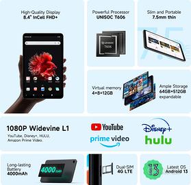 VENDO TABLET ALLDOCUBE IPLAY 50 MINI, NUOVO , SCHERMO 8.4 POLLICI FHD+ , 4+4 GB DI RAM , 64 GB DI SPAZIO DISCO ESPANDIBILE CON SD CARD FINO A 512 GB , PROCESSORE UNISOC OCTACORE , SISTEMA ANDROID 14 , 4G LTE , WI FI DUAL CHANNEL 2.4/5 GHZ , COMPRESO NEL PREZZO ACCESSORI ( COVER TPU BUMPER/ 2 VETRINI 9H GLASS / LINEA SMARTER DI 6 MESI ( CINEMA / SPORT / INTRATTENIMENTO/ FILM E SERIE ONDEMAND E TANTO ALTRO...) !!! SPEDISCO IN TUTTA ITALIA CON SDA EXPRESS O RITIRO A MANO ZONA CASORIA (NA)