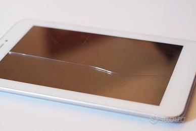 ideale per RICAMBI o RIPRISTINO. Il tablet si carica regolarmente, si accende e procedere ad attivare tutte le sue funzionalità, ma purtroppo un crepo ha rotto il display (che rimane integro solo grazie alla pellicola di protezione), di conseguenza si riesce a fatica gestire ogni app o funzione, in quanto il tab tende ad avere dei ritardi o impazzisce del tutto. Qualche striscio qua e la, ma tutto sommato non è messo male, si nota dalle foto solo un crepetto in angolo. Batteria ormai verso la fine, ma permette l'accensione ancora qualche ora: dotato di presa ricarica e jack cuffie, slot scheda sim (solo per banda 3G) + schedina memoria aggiuntiva, microfono, bluetooth, wi-fi, fotocamera davanti e dietro, tasti volume e accensione, sistema Android. Viene consegnato completo di: