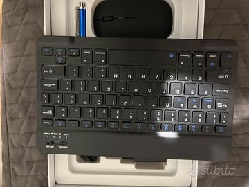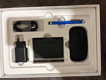 Completo con accessori (caricatore a muro, tastiera, mouse, pennino touch, cover a libro, supporto per appoggio)