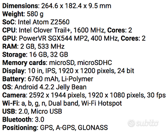 Causa inutilizzo, vendo splendido Tablet ASUS con caratteristiche mostrate in foto. Nessun difetto estetico o funzionale. Ideale per bambini come primo tablet. Caricabatterie, cavo, custodia e confezione sono ESCLUSI Ritiro presso mia abitazione a 2Km dal Casello A4-Rovato (BS)