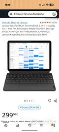 Vendo tablet Lenovo IdeaPad, acceso solo per verificare il corretto funzionamento. Ideale per studiare, lavorare o per l'intrattenimento. ✨ Caratteristiche principali: 📱 Display da 10.1 pollici 2K, molto nitido e con colori eccellenti. ⚡ 4 GB di RAM 💾 64 GB di memoria interna per app, documenti, foto e video. 🚀 Sistema ChromeOs, interfaccia intuitiva e compatibile con migliaia di applicazioni. 🔊 Altoparlanti con Dolby Atmos, suono potente e avvolgente. ⌨️ Include tastiera calamitata originale. Il prezzo nuovo su Amazon è 300 euro. Quindi prezzo super conveniente.