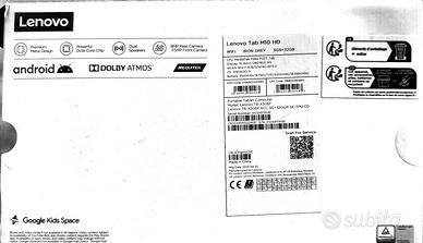 Vendo tablet LENOVO Tab M10 HD modello TB-X306F, completo di scatola originale, istruzioni, caricatore, cavo, n.1 custodia a libro, n.1 custodia a leggio. Il tablet è stato resettato con le impostazioni di fabbrica, è perfettamente funzionante ed è stato utilizzato e conservato con cura. Vendo per aver ricevuto in regalo un modello superiore. Specifiche tecniche: Dimensioni schermo10.1" Risoluzione del display1280 x 800 Pixel Tipo di pannelloIPS Luminosità schermo330 cd/m² Tipologia touch screenCapacitivo Densità di Pixel220 ppi (punti per pollice) Tipologia HDHD+ Rapporto d'aspetto nativo 16:10 Processore MediaTek Modello del processoreHelio P22T Frequenza del processore2,3 GHz Numero di core del processore8 Memoria RAM 3 GB Tipo di RAMLPDDR4x-SDRAM Velocità memoria3200 MHz Memoria interna32 GB Lettore di schede integratoSì Supporto di memoriaeMMC Tipi schede di memoriaMicroSD (TransFlash) Memoria espandibile fino a256 GB Scheda graficaImagination Technologies Numero di altoparlanti incorporati2 Numero dei microfoni2 Sistema audioDolby Atmos Fotocamera posteriore8 MP Messa a fuoco automatica Sì Fotocamera frontale 5 MP Connessione di rete mobileNo BluetoothSì Versione Bluetooth5.0 Standard Wi-Fi802.11a,802.11b,802.11g,Wi-Fi 4 (802.11n),Wi-Fi 5 (802.11ac) Porte USB 2.0 Tipo C1 Connessione cuffia3,5 mm Jack combinato per microfono/auricolareSì Colore del prodottoIron Grey Tipo di dispositivoFull-size tablet Materiale della scoccaMetallo GPSSì AccelerometroSì Sensore luce ambientaleSì Sensore di prossimitàSì PiattaformaAndroid Sistema operativo Android 11 Batteria Polimeri di litio (LiPo) Capacità della batteria5000 mAh Dimensioni e peso Larghezza153,3 mm Profondità8,15 mm Altezza244,2 mm Peso460 g
