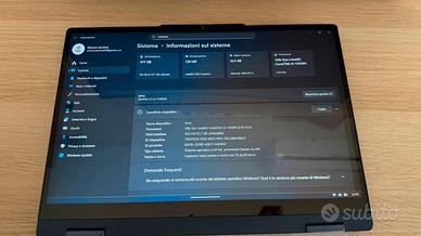 Vendo notebook convertibile Lenovo IdeaPad 5 2-in-1 (Gen 9) in condizioni eccellenti, pari al nuovo, Può essere utilizzato anche come tablet. Garanzia Attiva: Il PC è stato acquistato 1 anno fa, quindi dispone ancora di Garanzia Legale (fornisco ricevuta d'acquisto). Batteria come nuova: Essendo stato usato pochissimo, la batteria ha cicli di ricarica minimi e mantiene la durata originale al 100%. Incluso nella vendita: Notebook Lenovo Caricabatterie originale prezzo leggermente trattabili. Vendo per passaggio ad un altro portatile, utilizzato sporadicamente, acquistato ad ottobre 2024. È un computer potente e versatile, perfetto per chi cerca prestazioni elevate in mobilità. Monta un processore Intel Serie H (ad alte prestazioni), ideale non solo per ufficio e università, ma anche per carichi di lavoro più pesanti. Specifiche Tecniche: Modello: IdeaPad 5 2-in-1 14IRH9 Processore: Intel Core i5-13420H (13a Generazione, molto più potente delle versioni base "U"). RAM: 16 GB LPDDR5x (5200 MHz). Archiviazione: SSD da 512 GB NVMe. Display: 14" WUXGA (1920x1200) Touchscreen. Formato 16:10. Design 2-in-1: Cerniera a 360° per usarlo come Tablet, a Tenda per vedere film, o come classico Notebook. Sistema Operativo: Windows 11 Home originale. Porte: 2x USB-C (Thunderbolt/PD), 2x USB-A, HDMI 2.1, Lettore microSD, Jack Audio. Condizioni: Il PC è immacolato, tenuto con massima cura. Scocca e schermo sono privi di difetti. Batteria in ottimo stato. NOTA BENE: Per qualunque informazione aggiuntiva non esitate a contattarmi.