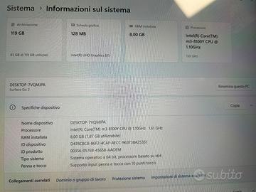 Vendo Microsoft Surface Go 2 nella sua configurazione più potente e completa (Modello 1927), ideale per professionisti, studenti e smart working grazie alla sua estrema portabilità e versatilità. A differenza della versione base, questo modello monta il processore Intel Core m3, che offre prestazioni nettamente superiori e una fluidità ideale per Windows 11 rispetto alla variante Pentium. Specifiche Tecniche (Verificabili dalle foto): Processore: Intel Core m3-8100Y (Turbo Boost fino a 3.40 GHz). RAM: 8 GB (essenziale per il multitasking e le app moderne). Memoria: 128 GB SSD (molto più veloce della memoria eMMC dei modelli base). Connettività: Versione con 4G LTE integrato (slot per SIM), per navigare ovunque senza Wi-Fi. Schermo: 10.5" PixelSense Touchscreen ad alta risoluzione. Sistema Operativo: Windows 11 Home già aggiornato (versione 23H2). Accessori inclusi nel pacchetto (Bundle completo): Tastiera Cover Originale (Type Cover): Colore grigio antracite, layout italiano, trasforma il tablet in un vero laptop. Surface Pen: Originale Microsoft, perfetta per prendere appunti a mano, firmare documenti o disegnare. Alimentatore originale: Incluso e perfettamente funzionante. Condizioni del prodotto: Il dispositivo è in condizioni estetiche eccellenti. Lo schermo è perfetto, senza graffi ( usato sempre con pellicola protettiva ion vetro temprato come si vede dall'immagine) La scocca posteriore e gli accessori sono stati tenuti con la massima cura. La batteria è in ottimo stato e garantisce un'ottima autonomia.