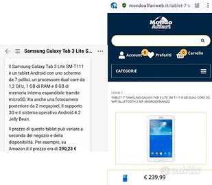 Il Samsung Galaxy Tab 3 Lite SM-T111 è un tablet Android con uno schermo da 7 pollici, un processore dual core da 1,2 GHz, 1 GB di RAM e 8 GB di memoria interna espandibile tramite microSD. Ha anche una fotocamera posteriore da 2 megapixel, il supporto 3G e il sistema operativo Android 4.2 Jelly Bean.