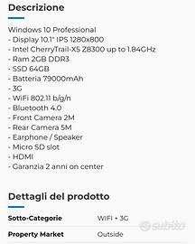 Tablet Yashi YP120; 10,2 pollici, con tastiera, Windows 10 Pro. Le altre caratteristiche sono visualizzabili sulle immagini. Ben funzionante, poco usato, modesti segni di invecchiamento della faccia posteriore che però non incidono sul funzionamento. La cover è molto comoda per mantenere il tablet in corretta posizione di utilizzo.