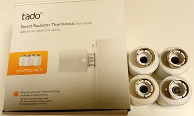 Kit TADO termostato intelligente V3 composto da 1 termostato principale con internet bridge (per collegamento cloud) + 6 teste termostatiche intelligenti + 1 sensore di temperatura wireless (io questo lo usavo in bagno dove gestiva 2 teste termostatiche). Tutto perfettamente funzionante, utilizzabile con app dedicata Tado per la gestione online anche da remoto. Vendo perchè sto passando all full-eletric quindi impianto di riscaldamento a gas è stato chiuso. Sistema TADO completamente integrabile in ambiente domotico Home Assistant (tutt'ora funzionabile).