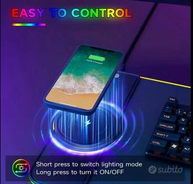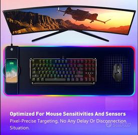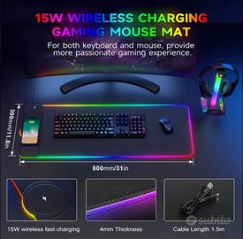 Migliora la tua postazione con questo tappetino mouse RGB di grandi dimensioni, dotato di ricarica wireless integrata. Perfetto per gamer e professionisti, offre un’ampia superficie antiscivolo e bordi cuciti resistenti.