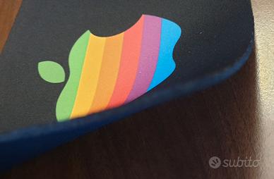 Tappetino per mouse nero con logo vintage Apple rainbow del mitico Macintosh. Le dimensioni di questo tappetino per mouse a forma rettangolare sono 18 x 22 x 0,3 cm di spessore, (sembra molto robusto e di buona qualità), credo sia di neoprene con uno strato superiore di tessuto dove è stampato il logo. Le condizioni sembrano ottime, senza nessun difetto visibile.