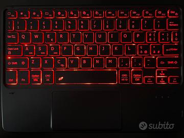 Tastiera Bluetooth con touchpad integrato, ricarica con cavo USB , retroilluminata, tre livelli di retroilluminazione e diversi colori. Venduto con la sua scatola originale, cavo USB per la ricarica, manuali per le istruzioni in più lingue. Per qualsiasi informazione non esitate a chiedere.