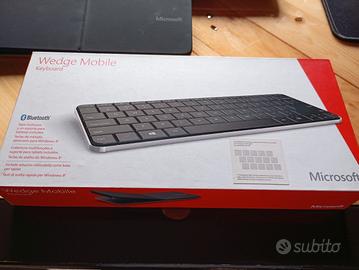 Tastiera Wedge Mobile Microsoft nera e grigia. Tastiera con layout Italiano (QWERTY). Funziona con 2 pile alcaline AAA (non incluse). Si connette a PC e Tablet tramite sistema bluetooth. Ottimizzata per Windows 8 funziona con tutti i Windows (testata sul mio windows 11), MAC e la maggior parte dei tablet (per vedere i dispositivi compatibili è presente un link sulla scatola).
