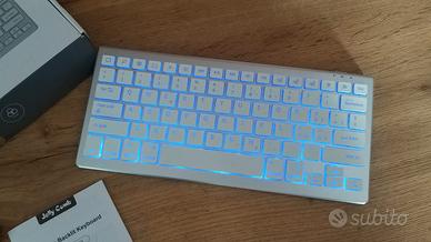 Tastiera bluetooth per tablet o altri apparecchi, ha varie colorazioni che possono essere spente e ha la capacita di poter essere collegata con tre dispositivi differenti contemporaneamente. In ottime condizioni, usata pochissimo
