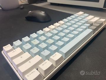 tastiera custom realizzata interamente da me, con scheda madre della apex pro mini, switch pink cream pro e keycaps azzuri e bianchi. 60% e qwerty