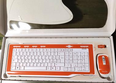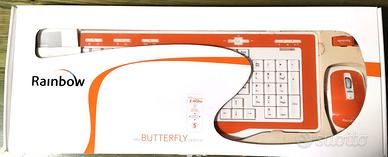Tastiera e mouse vintage wireless (senza fili)RBV Butterfly - Rainbow Desktop R8980B/G/N/P di colore bianco e arancione. Nuovo mai usato con scatola originale, completa di manuale, CD di installazione e chiavetta USB. La tastiera funziona con due pile AAA. Il mouse funziona con due pile AA. Le pile NON sono comprese nella confezione. Peso kg 1.400 ca.