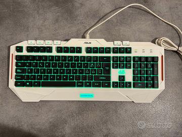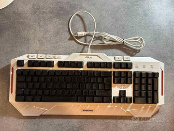 Tastiera gaming Asus Cerberus con layout italiano, connessione USB cablata. Interruttori a membrana, con personalizzazione fino a 12 macro dedicate e retroilluminazione LED multicolore regolabile. Piastra metallica interna e costruzione robusta per uso gaming e quotidiano. Venduta con scatola e accessori originali.