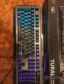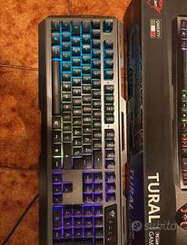 Tastiera da gaming Trust usata pochissimo non presenta graffi ed è pulita l unica cosa lo scatolo è un po ammaccato. Dotata di 3 colorazioni differenti come in foto, la porta di input è USB. Se si preferiace anche rialzabile come mostrato in foto