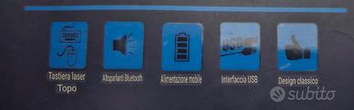 tastiera laser multifunzione con altoparlante powerbank mause bluetooth per collegare a tv tablet telefono pc ecc la scatola e leggermente rovinata perchè è stato aperto male ma il prodotto e nuovo mai utilizzato è garantito come e nemmenoe stato caricato cavo originale siggillato con godero in velluto antigraffio