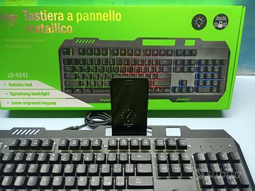 Vendo tastiera retroilluminata con struttura metallica NUOVA, mai usata perché mancano i tasti maggiore di e minore di. Presente anche alloggiamento per smartphone. Smartphone in foto non compreso nella vendita, ovviamente.