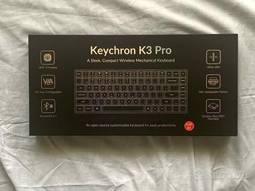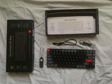 Vendo tastiera meccanica wireless Keychron K3 Pro con layout inglese, versione RGB backlight. Acquistata circa un anno e mezzo fa, è stata usata pochissimo ed è in condizioni pari al nuovo. Perfettamente funzionante e completa di tutti gli accessori originali (cavo USB-C, keycap aggiuntivi, scatola originale).