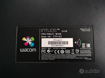 Wacom intuos pro small modello PTH - 451. Sprovvisto di scatola originale ma con tutti gli accessori originali e funzionanti (batteria, cavo, chiavetta wireless, porta penna con punte di ricambio e penna wacom compatibile). Perfettamente funzionate, mostra segni di normale usura.