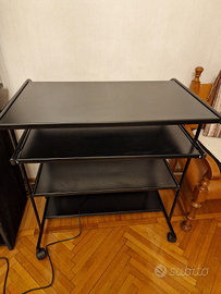 Tavolino porta computer in metallo con rotelle e 4 ripiani. Ripiano tastiera estraibile