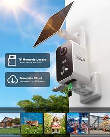 Telecamera di sorveglianza Xega 4G LTE da esterno senza fili, con scheda SIM preinstallata e ideale per case isolate, seconde case, cantieri, magazzini, parcheggi, camper e tutte le zone senza wifi. Prodotto nuovo, mai usato, in confezione originale.