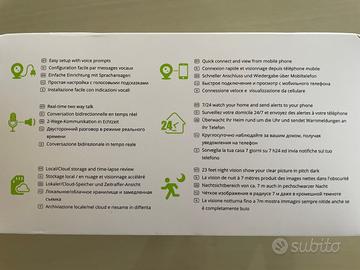 Telecamera con audio bidirezionale; microfono e autoparlanti integrati; connesione Wi-Fi; Slot per Micro SD; lente ottica in vetro a 4 strati; visione notturna; video in 1080 dpi