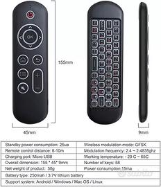 VENDO NUOVISSIMO TELECOMANDO VOCALE WIRELESS 2.4G, QUESTA MINI TASTIERA USB E' RICARICABILE ED E' UN AIR MOUSE UNIVERSALE PERFETTO PER TUTTE LE SMART TV BOX E PC. Dettagli prodotto: Controllo vocale: goditi la comodità dell'ingresso vocale con questo telecomando Air Mouse. Puoi chattare con gli amici, digitare parole o cercare qualsiasi cosa con la voce. Funziona con la casella di ricerca dell'input vocale integrata o l'app sul dispositivo. Ha anche un microfono ad alta fedeltà integrato per una qualità del suono chiara. Risparmio energetico efficiente: controlla il tuo dispositivo in modo più intelligente con il nostro telecomando Air Mouse. La sua modalità di sospensione intelligente mette il telecomando in stend by dopo 15 secondi di inutilizzo, riducendo al minimo il consumo energetico. Premere un tasto qualsiasi per sbloccarlo e continuare a utilizzarlo, senza preoccuparsi della durata della batteria o delle sostituzioni. Controllo senza soluzione di continuità: goditi il controllo senza interruzioni con il design comodo e leggero, in più ha la funzione del rilevamento i cambiamenti di direzione ad alta velocità, il giroscopio a 6 assi integrato consente di controllare direttamente i dispositivi spostando il telecomando del mouse in aria. Dite addio alle restrizioni dell'uso di superfici piane con un controllo senza sforzo. Migliorata l'esperienza del cursore: è possibile azionare il cursore in qualsiasi direzione con questo telecomando Air Mouse, senza bisogno di mirare allo schermo. Goditi un'esperienza di controllo wireless fluida e comoda. Regalo per i tuoi cari: questo telecomando Air Mouse vanta versatilità essendo adatto per uso personale e un regalo impressionante per ogni occasione. Goditi la comodità del controllo wireless sempre ed ovunque. Specifiche tecniche: Colore: nero. Consumo energetico in standby: 25ua. Distanza del telecomando: 8-10m Porta di ricarica: Micro USB Dimensione generale: 155* 45* 9mm Peso netto del prodotto: 58g Modalità di mo