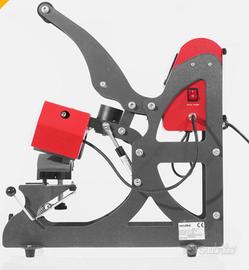 Termopressa Secabo TCC versione per la stampa di cappelli ad apertura automatica, con piastre curve di dimensioni 15 x 8 centimetri. Apertura a libro verso l'alto.