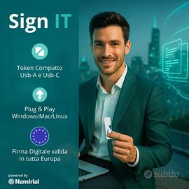 Token USB Namirial Sign IT per firma digitale qualificata, semplice da attivare online in meno di 10 minuti tramite SPID o CieID. Perfetto per firmare contratti, documenti fiscali, pratiche PA, bandi e atti ufficiali.