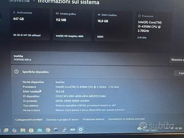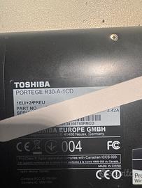 Toshiba Portégé R30-A-1CD. Tipo di prodotto: Computer portatile, Fattore di forma: Clamshell. Famiglia processore: Intel® Core™ i5 di quarta generazione, Modello del processore: i5-4310M, Frequenza del processore: 2,7 GHz. Dimensioni schermo: 33,8 cm (13.3"), Risoluzione del display: 1366 x 768 Pixel. RAM installata: 16 GB, Tipo di RAM: DDR3L-SDRAM. Capacità totale di archiviazione: 500 GB, Supporto di memoria: SSD. Tipo drive ottico: DVD Super Multi DL. Scheda grafica integrata. Colore del prodotto: Nero. Batteria ok (usata sempre con carica massima 80%). Alimentatore originale incluso.