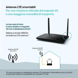 TP-Link Archer MR550 4G+ Cat6 300Mbps Router, Wi-Fi AC1200 Dual Band, 4g Router with Sim, Nano SIM, Gigabit LAN/WAN Port, MU-MIMO, No Configuration, TP-Link OneMesh Technology Router 4G+ avanzato: supporta 4G+ Cat6 per aumentare la velocità dei dati fino a 300 Mbps Collega una scheda SIM e gioca: non sono necessarie configurazioni, la compatibilità delle schede SIM in oltre 100 paesi è garantita da anni di test sul campo Supporto MU-MIMO: i flussi di dati simultanei aumentano il throughput WiFi e l'efficienza della rete. Supporta TP-Link OneMeshTM: collabora con i prodotti TP-Link OneMesh per creare una rete Mesh flessibile ed economica Migliore segnale per connessioni ovunque: goditi connessioni stabili ed efficienti con ogni dispositivo grazie alle due antenne LTE rimovibili esterne Porte Gigabit complete: fornisce connessioni cablate affidabili per dispositivi a uso intensivo di larghezza di banda come console di gioco e IPTV Modalità router Wi-Fi: collega un cavo Ethernet alla porta LAN/WAN per un accesso flessibile come opzione di backup se non riesci a ottenere una connessione 4G Facile configurazione e gestione tutto tramite l'app Tether