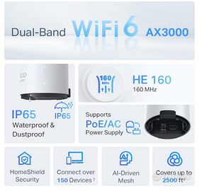 Full Gigabit Ethernet - 2 × porte Gigabit WAN/LAN Ethernet forniscono un solido accesso a Internet ad alta velocità. Utilizzate l'opzione PoE: Dovreste far passare un singolo cavo Ethernet dalla vostra rete interna (dove avete uno switch compatibile PoE o un iniettore PoE) fino alla posizione esterna dove desiderate installare il Deco X50-Outdoor. Questo cavo fornirà sia l'alimentazione che la connettività di rete