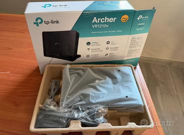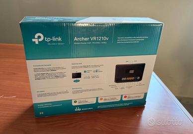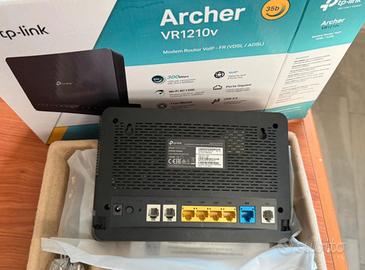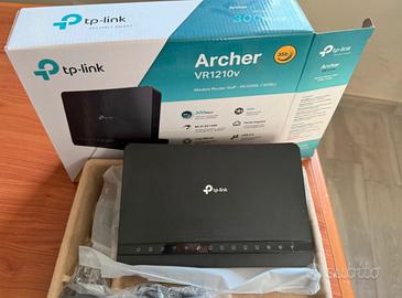 Modem router Tp-link, 300mbps, wireless AC1200 profilo 35b Modello Archer VR1210V Modem Router 35b per connessioni FR | EVDSL fino a 300Mbps Archer VR1210v è il nuovo modem router di TP-Link potente e compatto dotato di profilo 35b per connessioni FR - EVDSL | FTTC fino a 300Mbps, compatibile con i principali provider. Supporto VoIP Il supporto VoIP di Archer VR1210v permette di effettuare telefonate sulla linea internet collegando fino a 2 telefoni tradizionali o FAX. Connettività versatile Le numerose porte Gigabit permettono di creare network complessi mentre la porta USB 2.0 ti consente di condividere spazi di archiviazione e periferiche di rete. Specifiche Compatibile con connessioni F, FR, R Profilo 35b per connessioni FR - EVDSL fino a 300Mbps Wi-Fi AC1200 - fino a 300Mbps in 2.4GHz e 867Mbps in 5GHz 1 Porta Gigabit WAN 3 Porte Gigabit LAN Porta USB 2.0 1 Porta FXS supporto VoIP 11ac Wave2 - Tecnologia MU-MIMO e Beamforming profilo 35b, modem router, tp-link, evdsl 300mbps, wireless AC1200