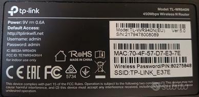 TP-Link TL-WR940N. Banda Wi-Fi: Banda singola (2.4 GHz), Wi-Fi standard: Wi-Fi 4 (802.11n), Intervallo di trasferimento dei dati WLAN (max): 450 Mbit/s. Tipo di interfaccia LAN Ethernet: Fast Ethernet, Velocità trasferimento Ethernet LAN: 10,100 Mbit/s, Tecnologia di cablaggio: 10/100Base-T(X). Algoritmi di sicurezza supportati: 64-bit WEP, 128-bit WEP, 152-bit WEP, WPA, WPA-PSK, WPA2, WPA2-PSK. Tipo di prodotto: Router da tavolo, Colore del prodotto: Nero, Indicatori LED: LAN, Potenza, status. Cavi inclusi: LAN (RJ-45).