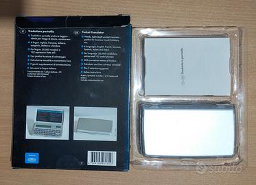 Traduttore portatile United Office: leggero,ideale per viaggi di lavoro,vacanze,ecc.. 6 lingue: inglese ,francese,tedesco,spagnolo,italiano e olandese. Per lingua: 20.000 vocaboli e 102 espressioni fatte utili; con pratica funzione di salvataggio, calcolatrice tascabile e convertitore euro; 9 giochi supplementari di intrattenimento. Inclusa batteria (CR 2032). Usato solo per provarlo. FUNZIONANTE!VENDO causa regalo non apprezzato.